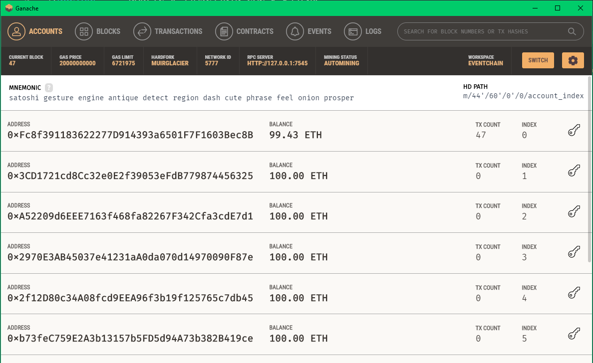 npx hardhat --network ganache testTests provide comprehensive coverage of all smart contract functionalities. They validate critical operations such as ticket creation, transfer, validation, and metadata updates. This thorough testing helps ensure that the EventChain platform is secure, reliable, and ready for deployment in real-world scenarios.